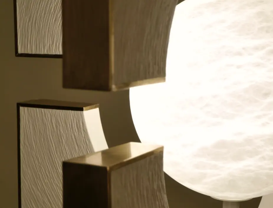 The external form is composed of hand-finished brass, concealing a hidden laser-cut steel framework that supports the plaster panels with precision. All molds were CNC-machined to ensure accuracy and consistency. To complete the system, we designed and produced a custom 3D-printed fixture, enabling a bespoke bulb solution that softly illuminates the alabaster sphere at the heart of the piece.